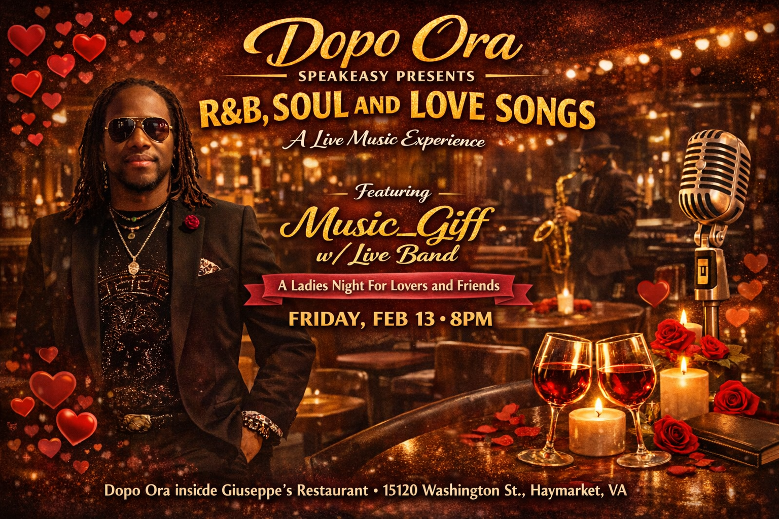 This is a night you feel.Dopo Ora Speakeasy (We're in the Big Room) turns into a candle-lit R&B lounge as Music_Giff and live band deliver love songs, soul classics, and smooth grooves in an intimate, upscale setting built for connection, cocktails, and late-night energy.
